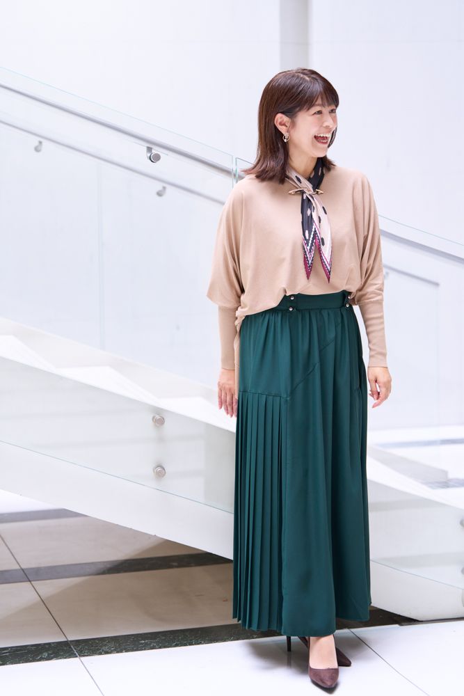衣装協力:スカート¥16,940、ニット¥17,380、スカーフ¥4,290(全てMARIED’OR)
