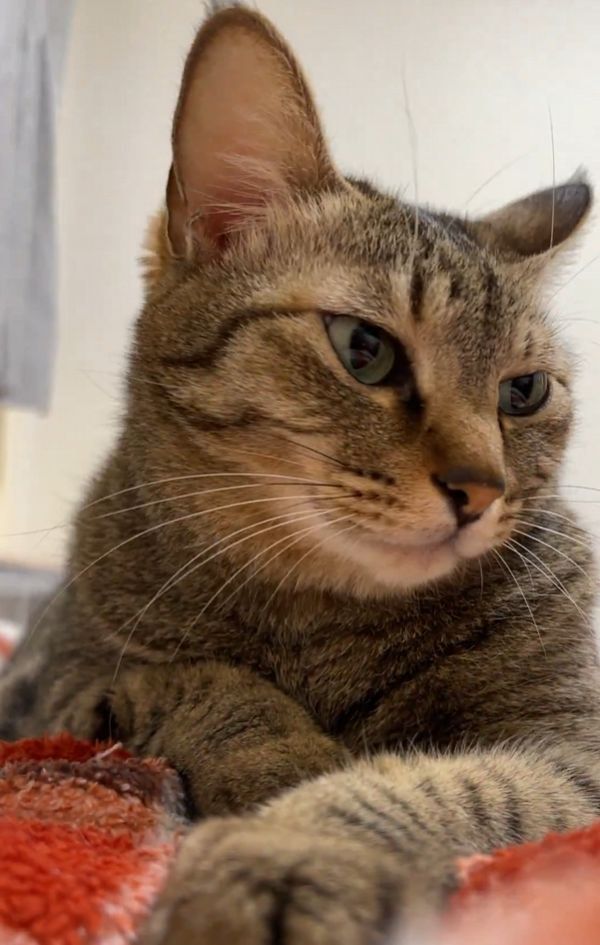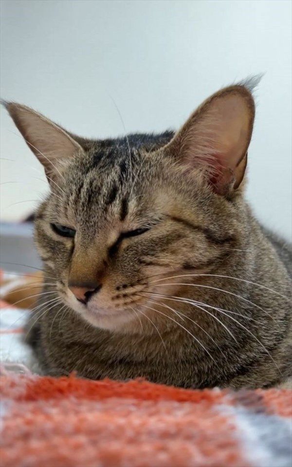 その布団の上には、キジトラの『小豆』ちゃんが! すぐ目の前にいるので、体の上に乗っかっているようです。