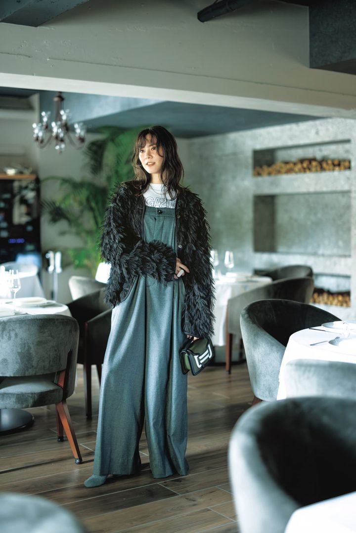 カーディガン¥129,800(アンスクリア/アマン)オールインワン¥59,400(サクラ/インターリブ)Tシャツ¥17,600(サードマガジン)バッグ¥152,900(ピエール アルディ/ピエール アルディ 東京)ショートブーツ¥55,000(ヒューン/クルーズ ショールーム)ネックレス¥96,800(ハイク/ボウルズ)ダブルフィンガーリング¥55,000(リューク)
