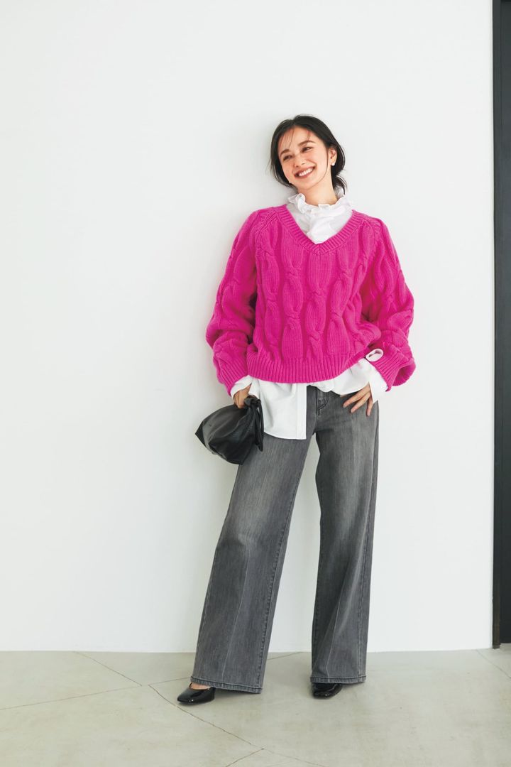 センタープレスはワイドを選ぶとコンサバ感が払拭できる。寒い時期だからこそ挑戦できる重ね着で、フリルブラウスもニットの下に合わせて上品な雰囲気に。パキッとピンクの色選びも甘くなりすぎないのでおすすめ。