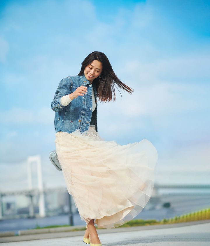 旬の〝エアリー〟素材は風のある季節でも可愛さキープ。エアリーなチュールこそ重量感のあるデニムジャケットと辛口に仕上げるのが正解。甘いチュールやシアーをカッコよく着てこなれ感を出してみて。気温差のある日はコートと合わせてもいいかも。