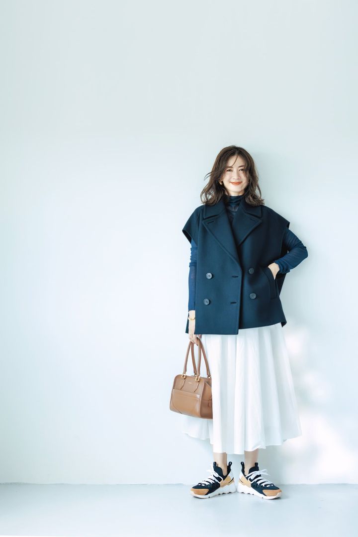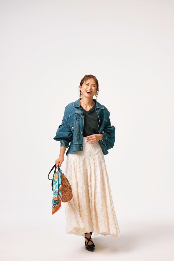 定番のGジャン×白スカートはシルエットを更新して新鮮さアップ。カジュアルに感じがちなデニムジャケットは甘さを抑えつつもふんわりボリューム袖でチャーミングな印象に。柔らかいドラマティックスカートでコーデに優しさもプラス。