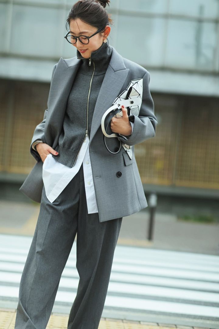 ボンディングジャケットは季節を跨いでブリッジ名品としても着こなせる中間アウター。カジュアルなボンディング素材でも構築的なフォルムだから仕事にもオススメ。オフィスコーデは着るだけで洒落るグレー配色が最適。