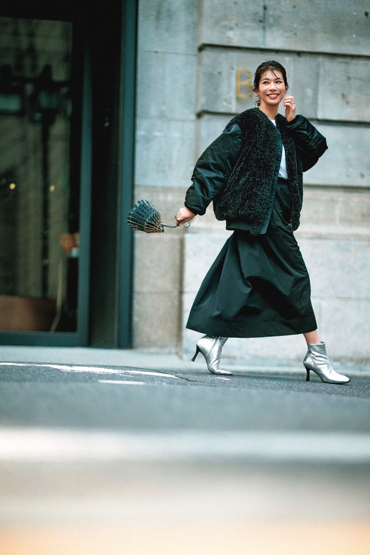 ボアとスカートの甘さで冒険アイテムのMA-1を攻略。ポイントポイントのアクセサリーやブーツはシルバーでアクセントに。重くなりがちな冬の黒はボアの柔らかな素材感で華やかな仕上がりに。