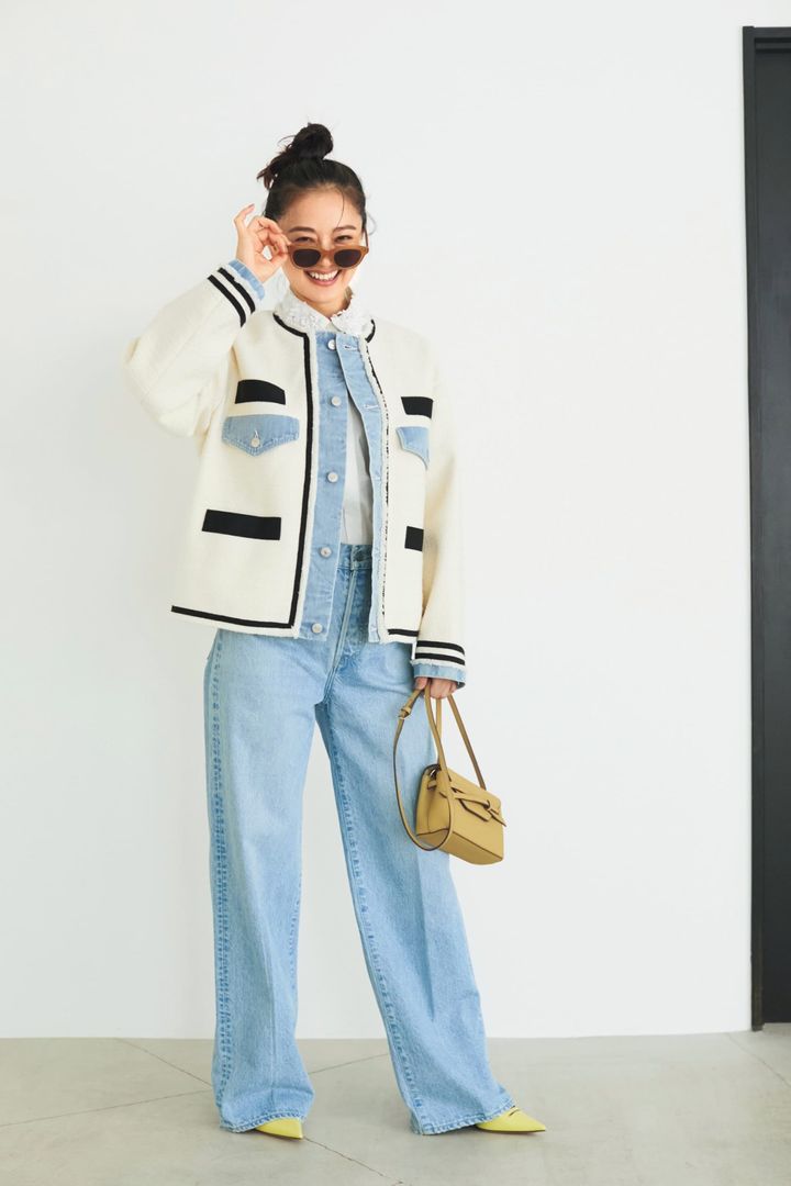 寒暖差のある季節にはジャケットあると安心。ラフ感のあるワイドパンツとフォーマル感のあるツイードジャケットはデニムコンビで統一感を。暗くなりがちな冬でも、パステルイエローのパンプスを差し色にして華やかさアップ。