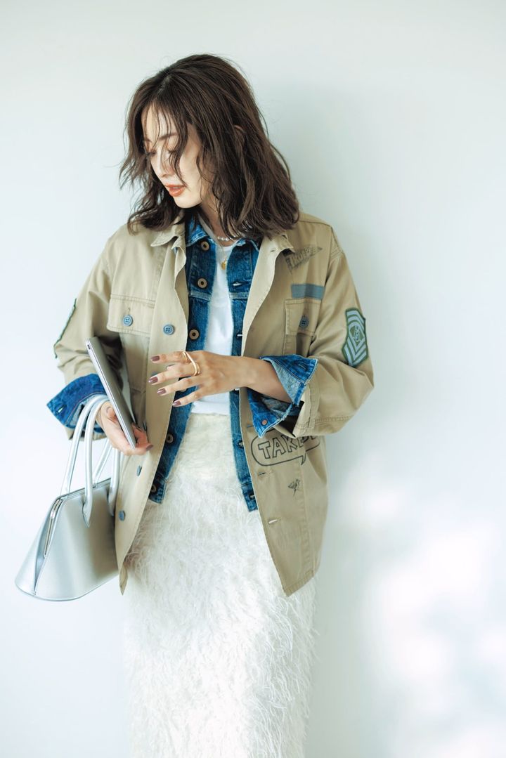 ミリタリージャケット¥115,500デニムジャケット¥102,300Tシャツ¥29,700スカート¥91,300パールネックレス¥385,000(すべてマディソンブルー)バッグ¥52,800(ヴァジック/ヴァジックジャパン)靴¥185,900(ピエール アルディ/ピエール アルディ 東京)ピアス¥39,600リング¥46,200(ともにブランイリス/ブランイリス トーキョー)コインネックレス¥27,500(マリハ)