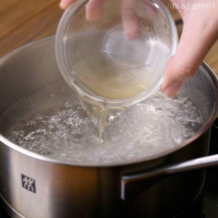 ※酢を加えることで卵白が素早く固まり、湯の中で飛び散ることを防ぎます。