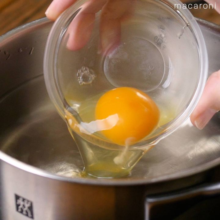 湯に酢を入れるとたんぱく質が固まりやすくなり、白身が飛び散らずキレイなポーチドエッグを作ることができます。