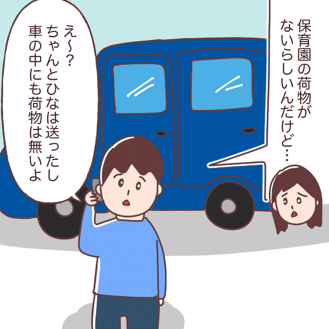 「保育園の荷物がないらしいんだけど・・・」とママさんがパパさんに電話をすると「え~?ちゃんとひなは送ったし車の中にも荷物は無いよ」と不思議そうなパパさんです。