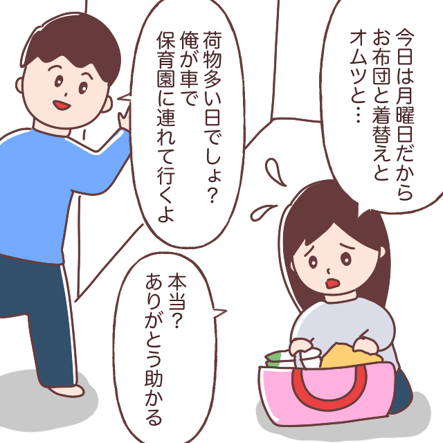 するとパパさんが「荷物多い日でしょ?俺が車で保育園に連れて行くよ」と言ってくれたので、ママさんは有難くパパさんの言葉に甘えることにしました。