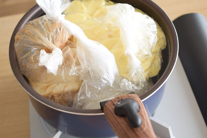 耐熱皿を入れた鍋にお湯1Lを沸かし、沸騰後にポリ袋を入れます。料理によって加熱時間は違うので、終わった順にお湯から引きあげ、火を止めたのは点火からおよそ30分後でした。