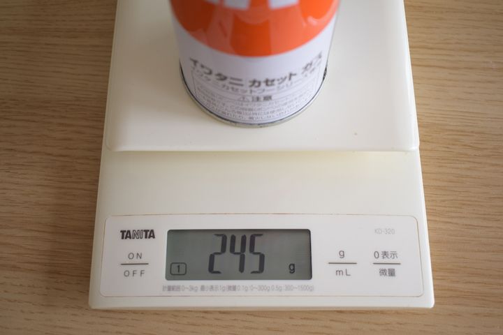 今回は3食分を26℃の環境で調理して、ガスを約100g使用しました。250g入りのカセットボンベの1/2本にも満たない量でした。まったく同じ条件で7日間過ごした場合、約700gのガスを使うことになります。カセットボンベに換算すると約2.7本です。