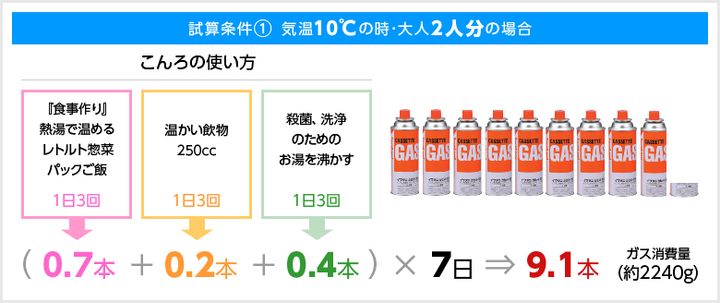 気温10度の場合、レトルト食品を温めることを1日3回、温かい飲み物を飲むためにお湯を沸かすのを1日3回、殺菌・洗浄のためにお湯を沸かすのを1日3回、これを7日繰り返した場合、ガスの消費量は約2240g、カセットボンベにすると9.1本使う計算になるのだそう。