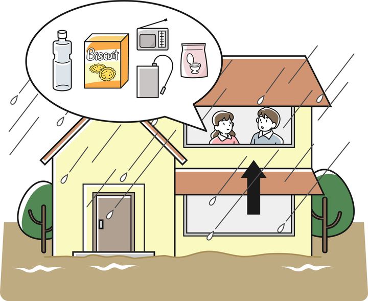 自宅で垂直避難をした場合は、自治体が定めている避難場所などに比べて、支援物資が届きにくくなる恐れがあります。東京などの海抜0メートル地帯の中には、近くの河川が氾濫した場合、水が引くまでに1週間以上かかると想定されている地域もあります。垂直避難が長引いても水と食料がもつよう備えておきましょう。