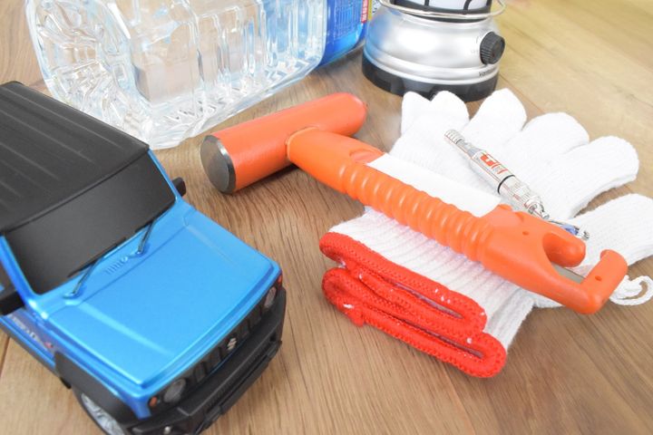 車通勤であれば、車載用の防災セットを備えましょう。緊急脱出用ハンマー、ランタンや飲料水、携帯トイレ、衛生用品は必携です。