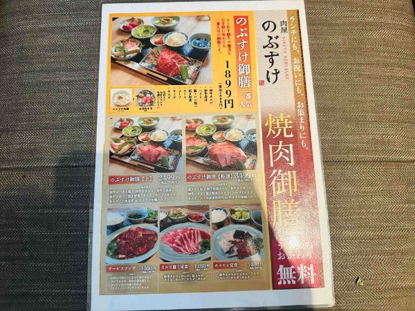 のぶすけ御膳は肉の種類が違う【上】と【特選】を含む3種類。 「サービスランチ」「カルビ盛り定食」「ホルモン定食」などもあります。