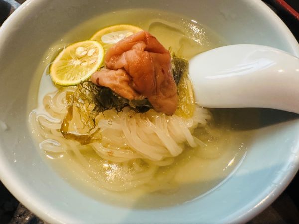 肉寿司はのぶすけ冷麺 (ハーフ) に変更することもできるので、生のお肉が苦手って人でも安心ですよ。 歯ごたえのある麺の上には梅干しがのっています。さっぱりとした味なので箸休めとしてもおすすめ。