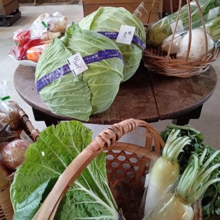 ご近所の農家さんの野菜です。大きなキャベツがお安くて、購入‼葉付きの大根も買っちゃいました。目立つ位置にあるので食事のオーダーそっちのけで、しばし品定めタイム‼