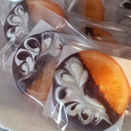 カフェ手づくりのオリジナルチョコレート。ゴージャスな模様が描かれています。こちらは土湯温泉・山水荘のお部屋菓子にも使われているそうですよ。