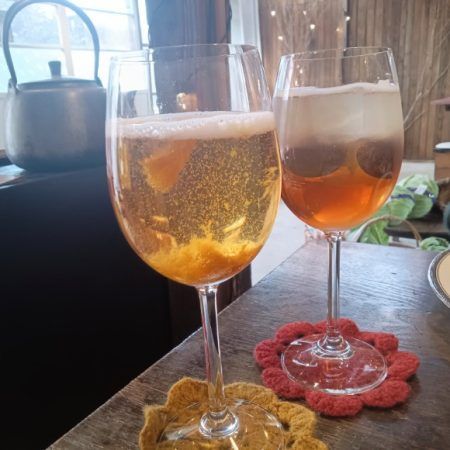 ビネガーソーダの梅と巨峰です。手前が梅で私が飲みました。どちらも果肉も楽しめます。爽やかな甘味です。食事と一緒に提供してもらったのですが、食事のじゃまをしないドリンクでした。