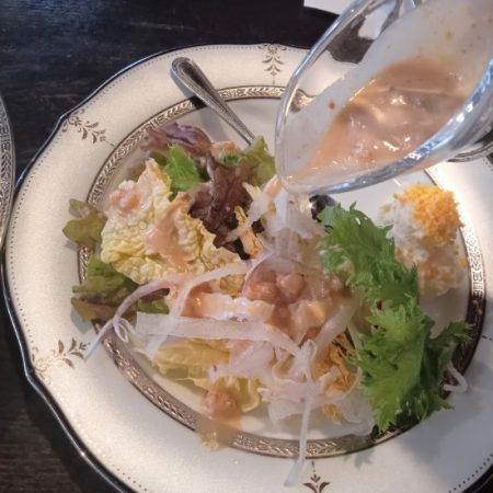 野菜は新鮮で味がよかったです。ドレッシングはもち麦ドレッシングなのだそう…もち麦のつぶつぶが見えるでしょうか⁈食感が楽しく味もGood‼おうちでも、もち麦を入れてみようかな…良いことは真似したくなりますよね‼