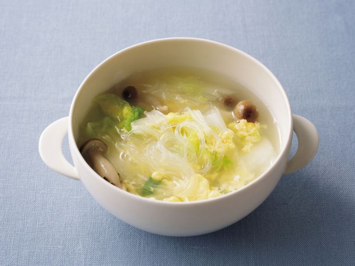 (2)鍋に白菜、しめじ、春雨、水2カップ、鶏ガラスープの素、塩小さじ1/3、こしょう少々を入れて中火にかけ、煮立ったらふたをして3~4分煮る。(1)の溶き卵を回し入れ、ふんわりと固まったら火を止める。