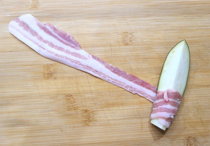 2. 豚肉をまな板に広げ、なすにくるくると巻きつけていきます。巻きつけたら塩、こしょうで下味をつけておきます。