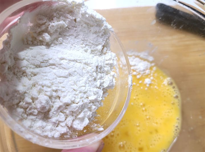 3. ボウルに卵を割り入れ溶きほぐします。薄力粉と水を加え、さらによく混ぜます。