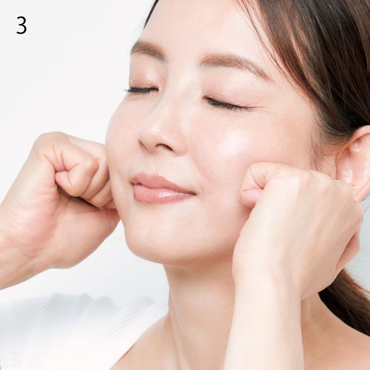 3.噛む時に使う咬筋(嚙み合わせのところ)は硬く分厚く発達しやすいので、輪郭のもたつきの原因にも。外側に円を描くようにグリグリと15回転ほど押し回すとこわばりがほぐれます。