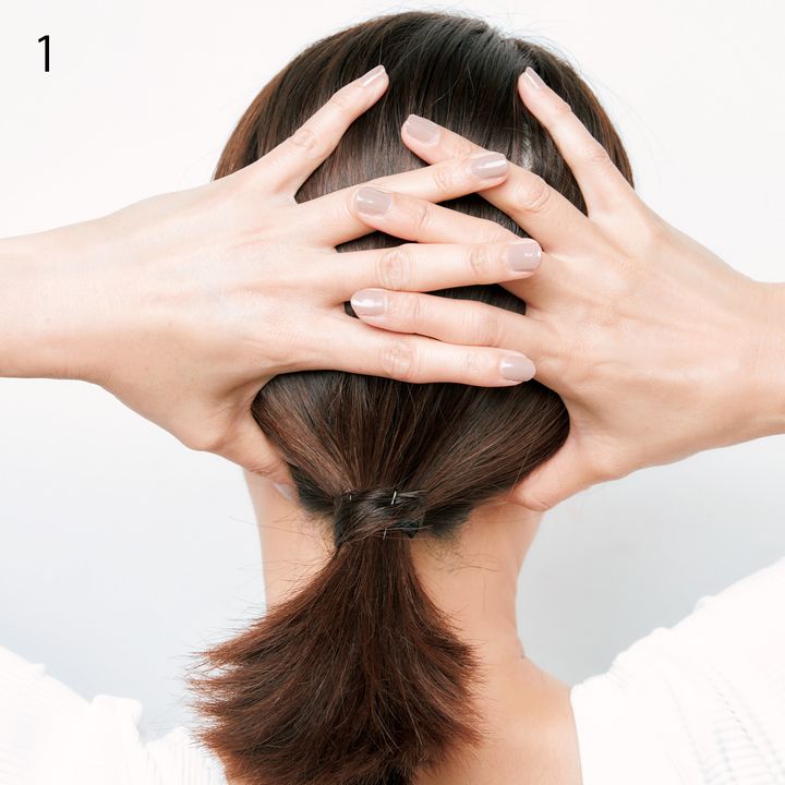 1.後頭部に老廃物や浮腫みを溜め込むとフェイスラインに流れてくるので、親指で後頭部を押し上げるように圧をかけ親指の位置を少しずつ外側にずらしながら揉みほぐします。