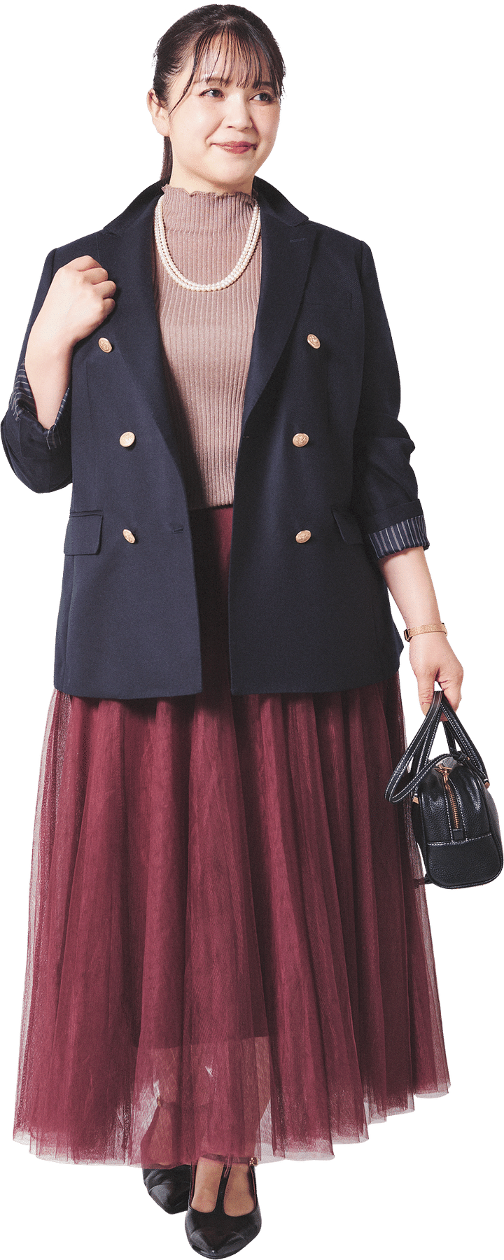 バーガンディーのチュールスカートとパールネックレスを合わせて、上質なブレザーをレディライクに着てみました。袖裏がストライプ生地だから腕まくりしてもオシャレ!