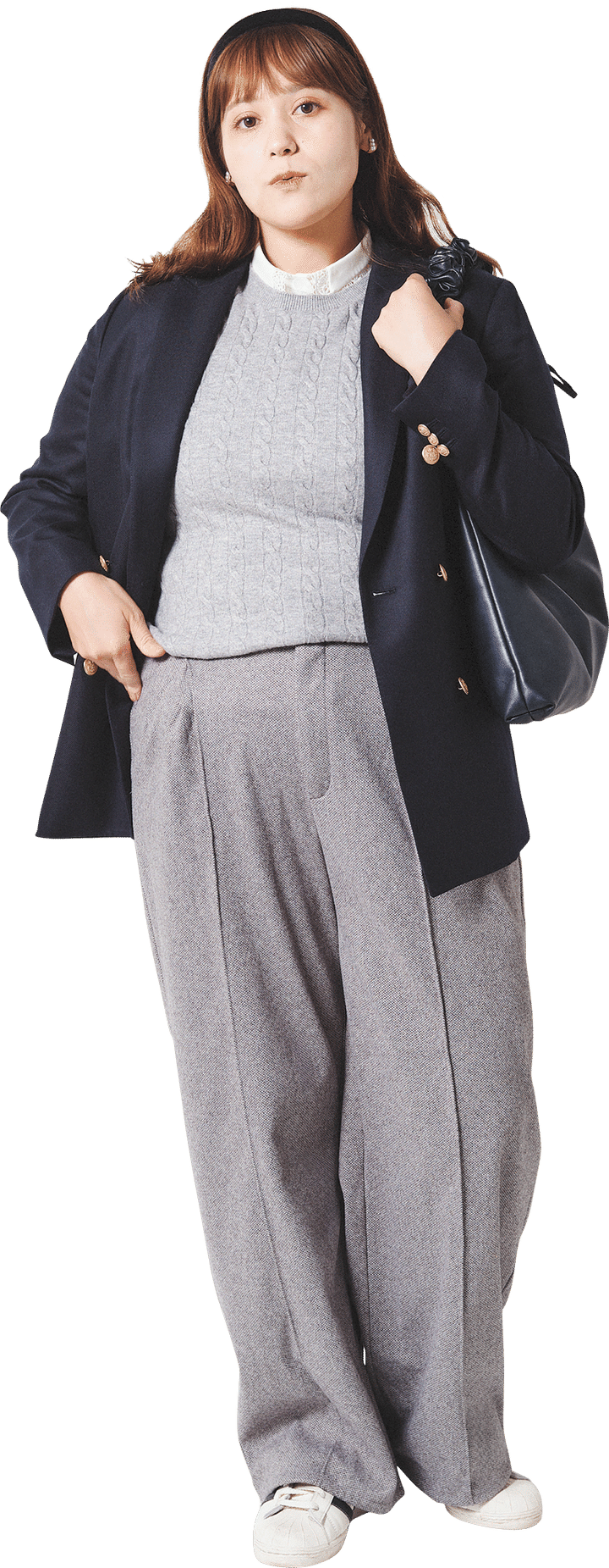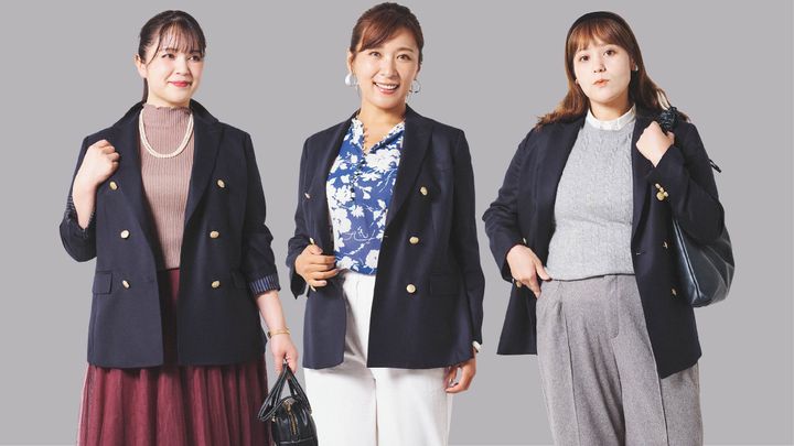 ラファモたちが等身大の着こなしを披露する特別企画。今回はラ・ファーファや大人ラファーファでもお馴染みのスタイリスト木下枝美さんが、数あるプラスサイズアイテムの中から厳選した”絶対に手に入れてほしい神アイテム・NEWYORKERのネイビーのダブルボタンブレザー”を自分たち流に着こなします。