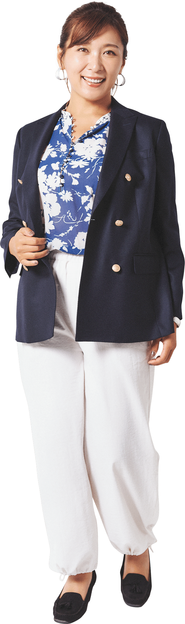 かっちりとした印象のブレザーだったので、テロンとした柔らかい素材のカーゴパンツで裾を絞りカジュアルダウン。さらに花柄のブラウスで華やかさを出しました。