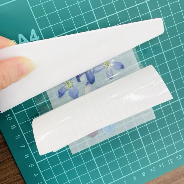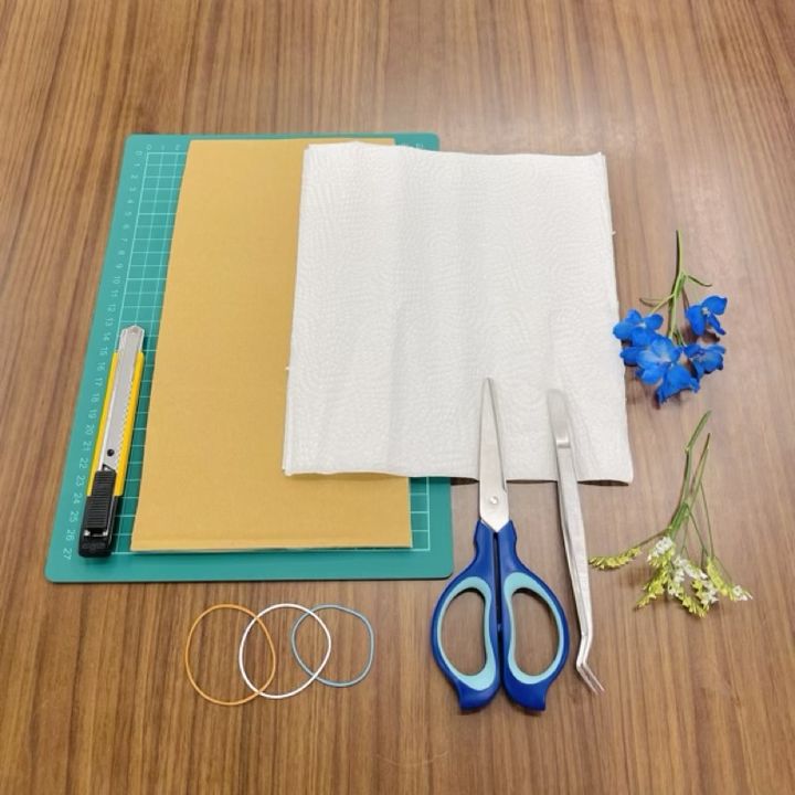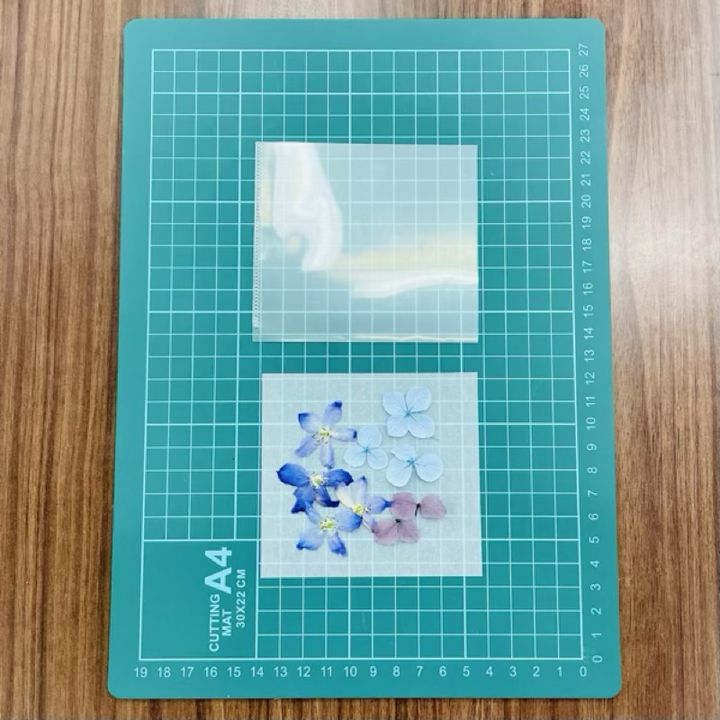 切る時は、カッターを使い、押し花のない裏側からカットすると、ティッシュがちぎれずきれいに仕上がります。