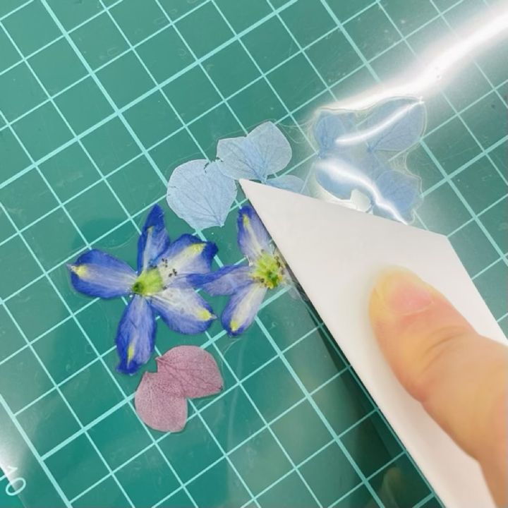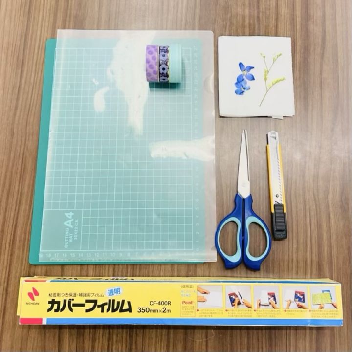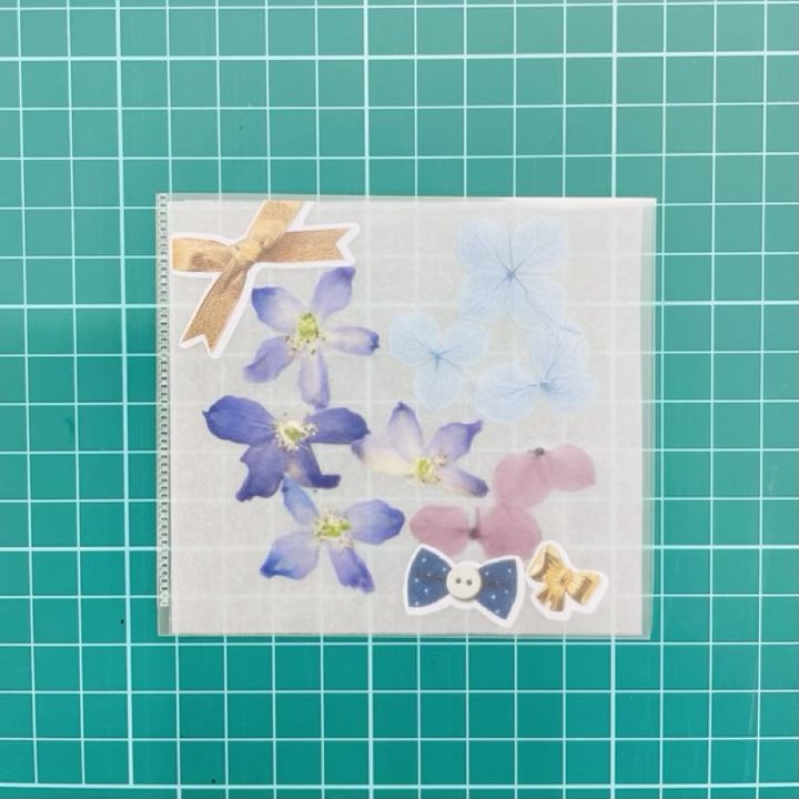 大きめに切ったカバーフィルムを、台紙の上から貼って押し花を固定します。