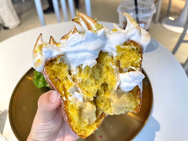 割ってみるとこんな感じ。中には生クリームとカスタードクリームが。もちもちであま~い。軽い口当たりで1個ペロリです。