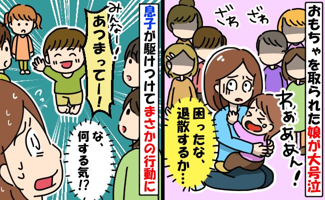 子育て支援センターのオープンスペースで遊んでいると、おもちゃをとられて娘が大号泣。どんなにあやしても泣き止まず、ほかのママやボランティアさんから注目されるほどの声に。急いで退散しようとしたとき、「ぼくにまかせて!」と現れたのは長男で……!?