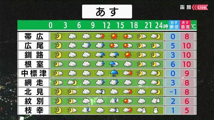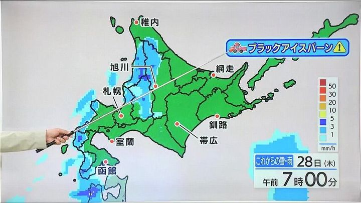 今後の予想を見ると、今夜は道北でも天気が崩れます。その後は一旦やみますが、日付が変わるとまた、道央や道南から雨が降るでしょう。内陸など0度近くまで気温が下がるため、雪がまじったり、ブラックアイスバーンになったりするおそれがあります。車の運転は注意して下さい。