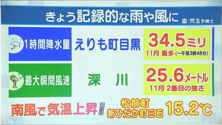 どちらも早朝に観測されましたが、日高地方のえりも町目黒では、1時間に34.5ミリと11月史上最も激しい雨が降りました。空知地方の深川では南東の風が吹きました。