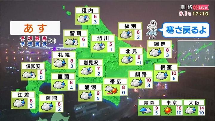 寒さが戻り、雨や雪が降るでしょう。最低気温は、札幌など道央や道南でけさより5度以上低くなります。最高気温は広く一ケタで手袋や厚手の上着が必要です。