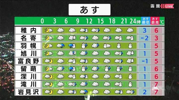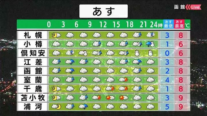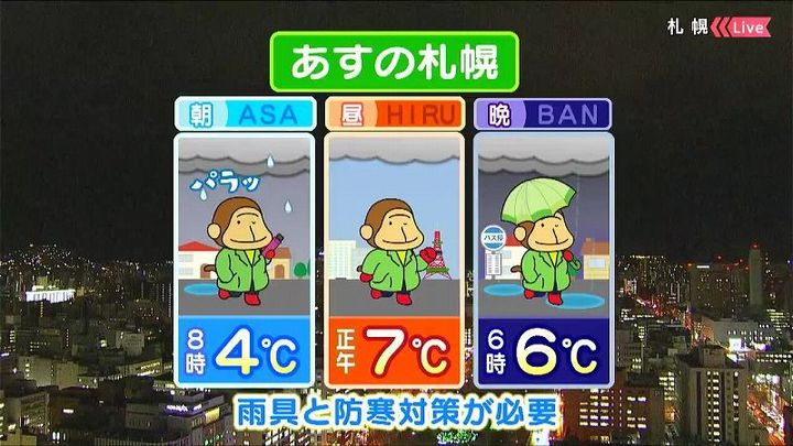 では、あすの札幌です!朝昼晩の天気をもんすけでお伝えします!
