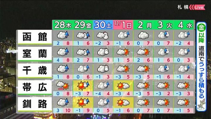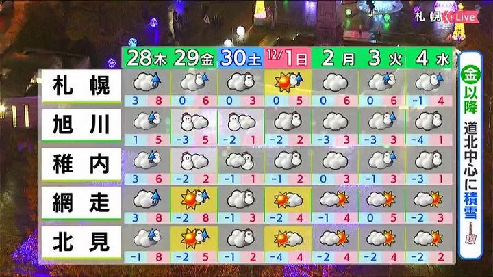 29日(金)と30日(土)は寒気が強まります。札幌や稚内、オホーツク海側ではうっすら積盛る程度ですが、旭川ではまとまった雪になりそうです。来週も寒さが続くため、旭川では根雪になるかもしれません。