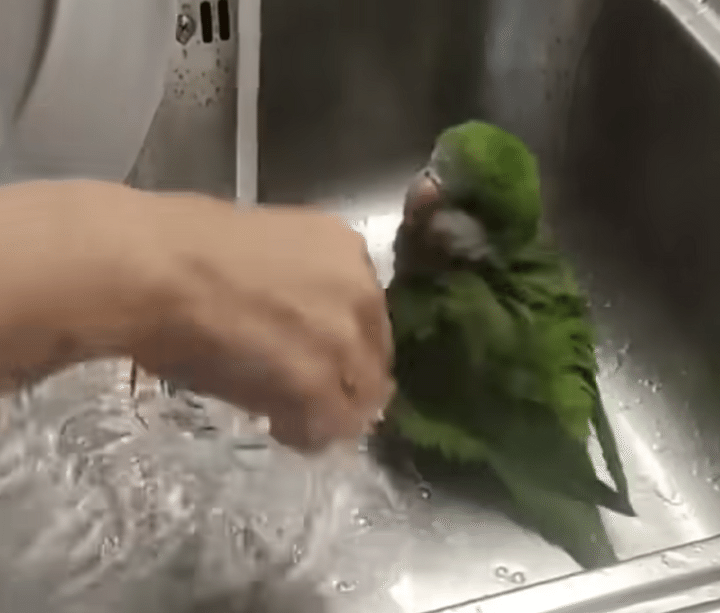 そうじゃないのに! 鳥さん、食器洗いのついでに水遊び♪