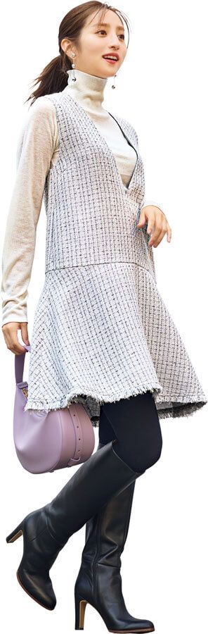 ブーツとタイツの色みをつなげることで脚長効果が。柔らかな白のジャンスカスタイルを、きりっと引き締める役割も担ってくれます。