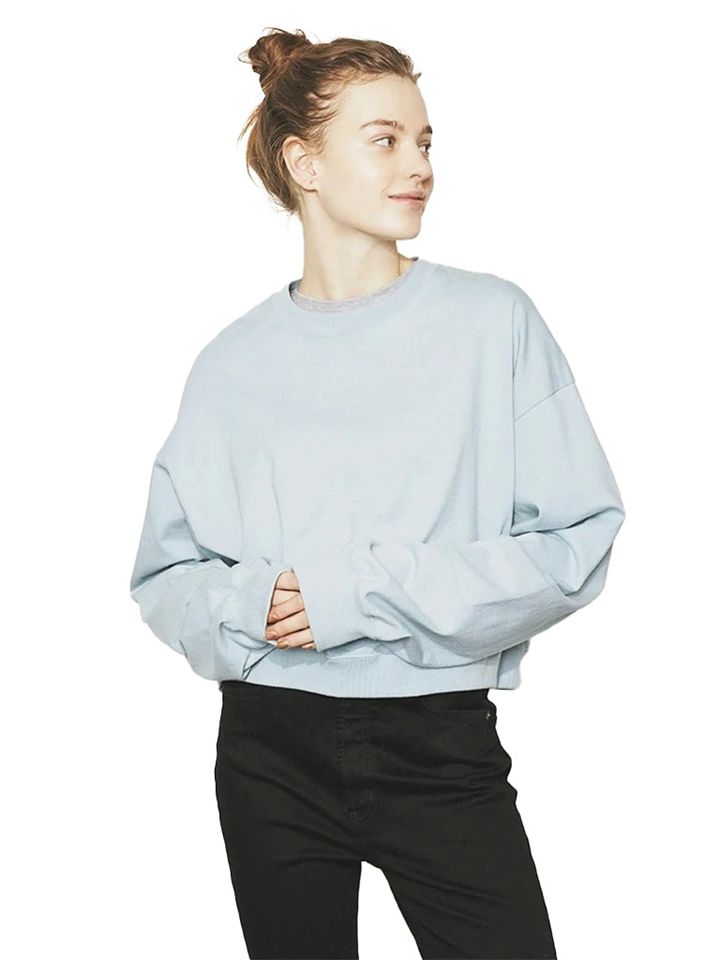 ややくすんだグレーが、清涼なブルーを今に引き寄せ。どちらも淡いトーンでまとめれば、ぶかっとしたそでのカットソーが女性らしく。