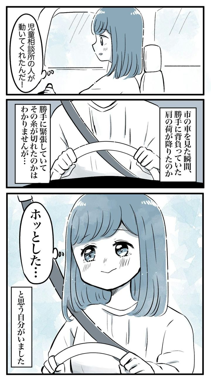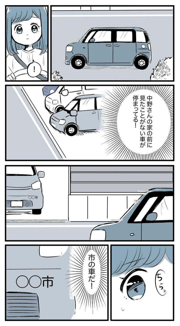 児童相談所へ通告した翌日、気になって中野さんの家の近くへ行ってみた主人公。すると、市の車が停まっていました。最近、中野家のことでモンモンと悩んでいた主人公にとっては、ホッとした瞬間でした。