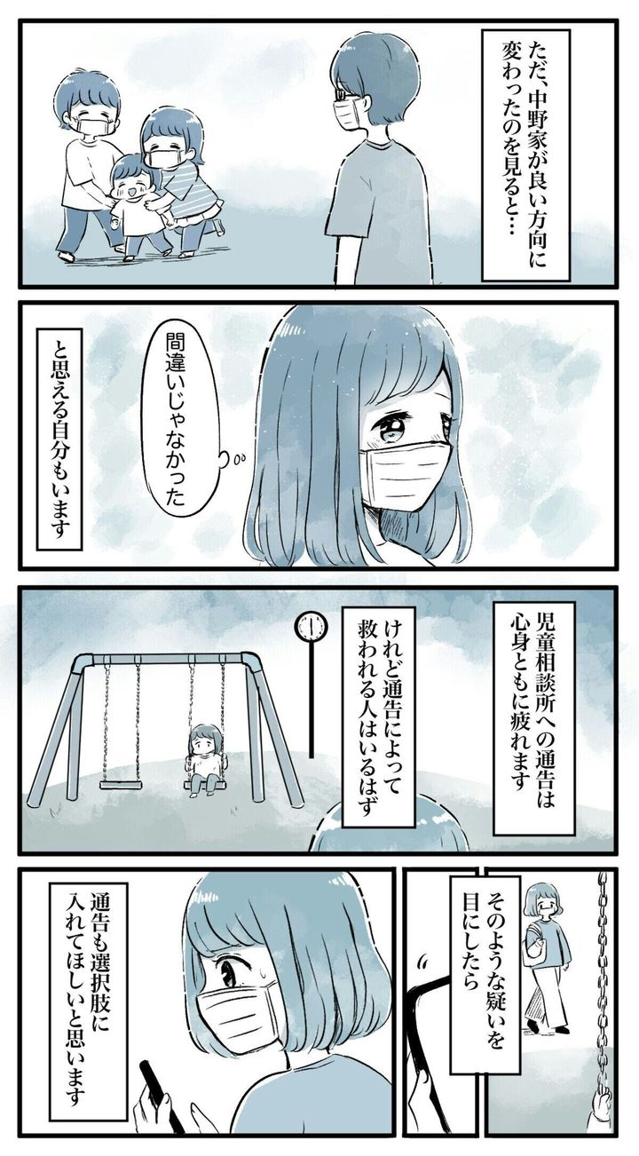 ご近所さんを児童相談所へ通告するなんて、できれば避けたい行為ですよね。ですが、主人公が語っているように「救われる人」がいるのも事実。