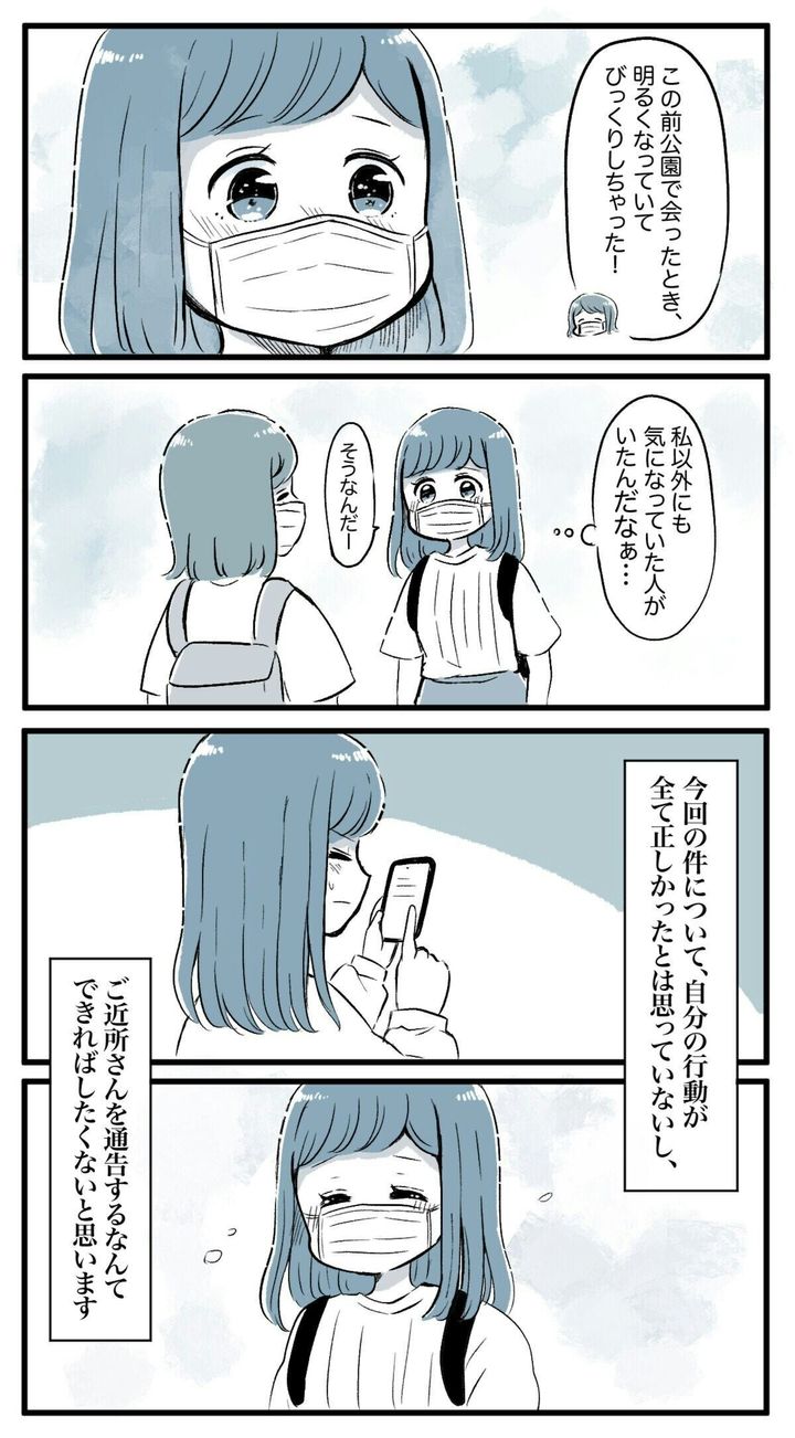 他にも、虐待と思われる行為を何度か目撃した主人公。家族や友人に被害がでてしまう前に、何とかしなければ…と思い、勇気を出して児童相談所へ通告しました。