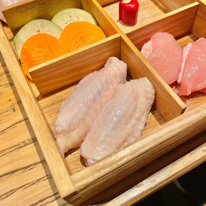 新鮮な鶏肉6種と季節の野菜2種が詰まった看板メニューで