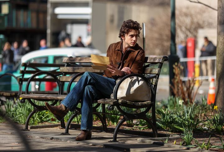 Timothee Chalamet is seen on the set of "A Complete Unknown" in Downtown, Manhattan. on March 24, 2024 in New York City.